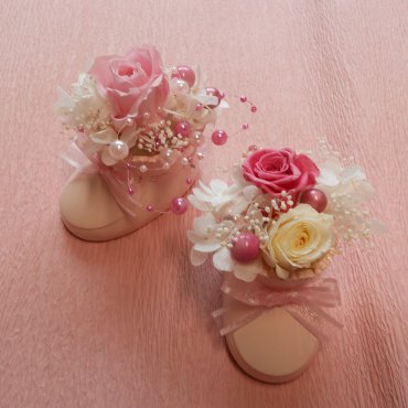 お子様誕生の記念に、女の子用(ピンク)と男の子用(ホワイト)のベビーシューズでお作りします。